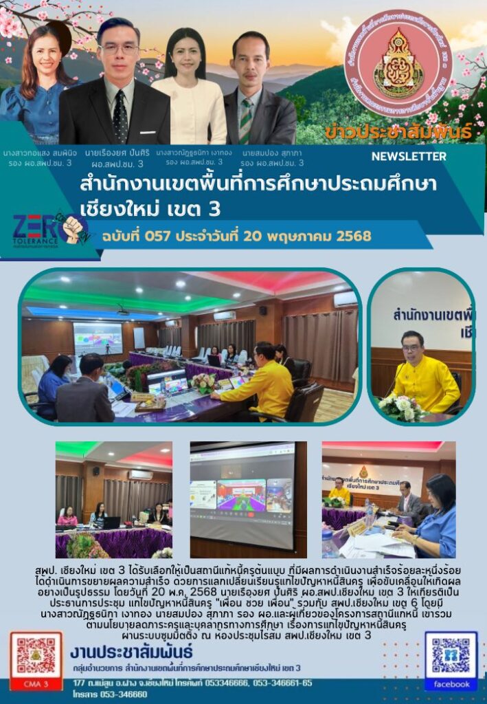 สำนักงานเขตพื้นที่การศึกษาประถมศึกษาเชียงใหม่ เขต 3 ได้รับคัดเลือกเป็น “สถานีแก้หนี้ครูต้นแบบ” ร่วมกับอีก 38 เขตพื้นที่ทั่วประเทศ หลังสามารถดำเนินงานแก้ไขปัญหาหนี้สินครูได้อย่างสำเร็จ 100%
