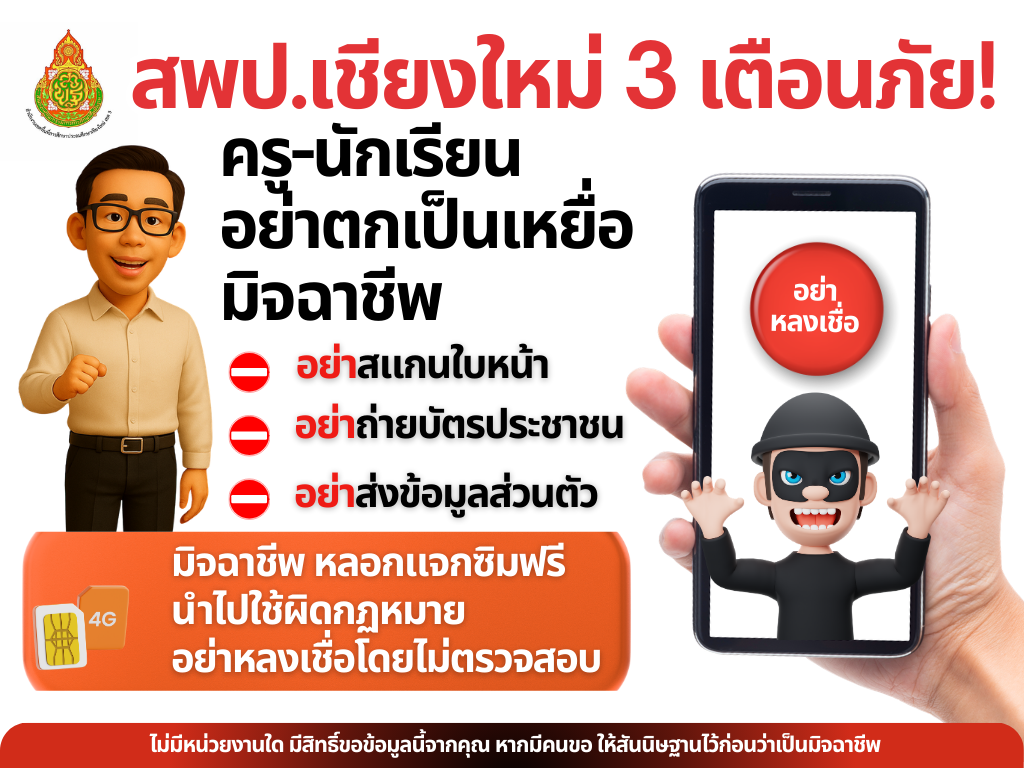 สำนักงานเขตพื้นที่การศึกษาประถมศึกษาเชียงใหม่ เขต 3 นำโดย นายเรืองยศ ปันศิริ ผู้อำนวยการฯ ขอแจ้งเตือนครู บุคลากรทางการศึกษา และนักเรียนในสังกัด ให้ระมัดระวังการถูกหลอกลวงจากกลุ่มมิจฉาชีพที่แอบอ้างจัดกิจกรรมแจกซิมการ์ดฟรี โดยหลอกให้สแกนใบหน้า หรือถ่ายภาพบัตรประชาชน อ้างว่าใช้สำหรับลงทะเบียนรับสิทธิ์ แต่แท้จริงแล้วนำข้อมูลไปใช้ในทางทุจริตและอาจก่อให้เกิดความเสียหายตามมา